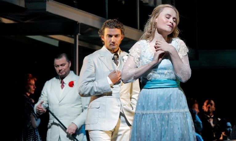 Tenor Jonas Kaufmann is riveting as the title character of Gounod’s popular opera, seen in this Live in HD presentation of Des McAnuff’s thrilling 2011 production that places the mythical and timeless story in an early 20th-century setting. René Pape as Méphistophélès is menacing and elegant in equal measure, and Marina Poplavskaya delivers a searingly intense portrayal of the innocent Marguerite. Russell Braun as her brother, Valentin, shines in his Act II aria. On the podium, Yannick Nézet-Séguin brings out all the lyricism and drama of Gounod’s score.