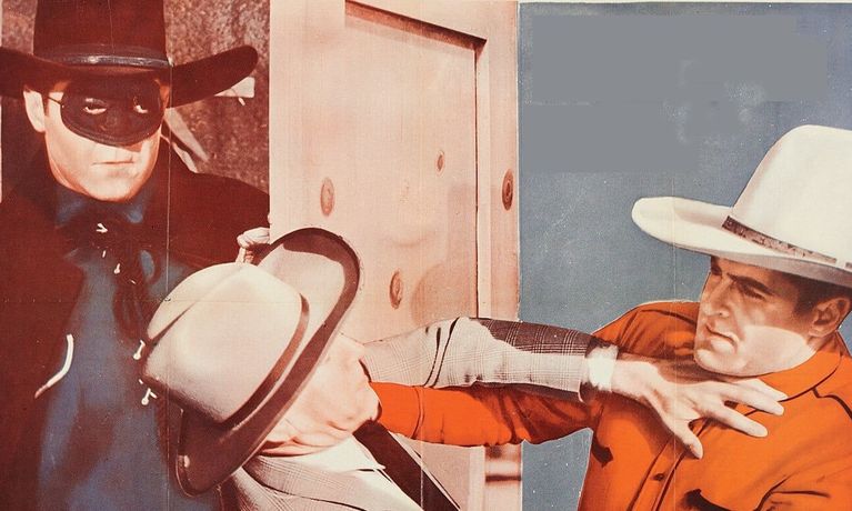 Cowboy puts on a black mask and a black outfit to fight a gang of land-grabbing crooks.