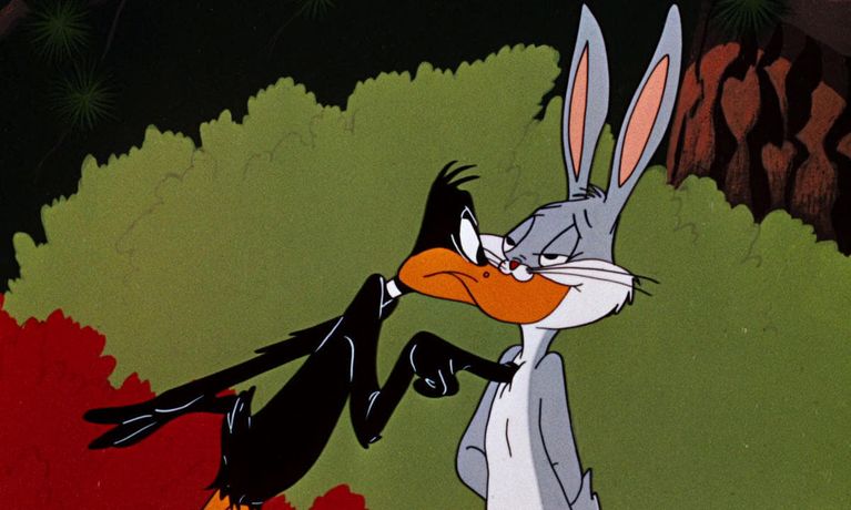 The cartoon finds a row of signs saying it's rabbit season ("If you're looking for fun, you don't need a reason. All you need is a gun, it's Rabbit Season!"). Bugs Bunny and Daffy Duck again are arguing over which of them is “in season” (it is really Duck Season, as Daffy says in the beginning), while a befuddled Elmer Fudd tries to figure out which animal is telling the truth. Between using sneaky plays-on-words, and dressing himself in women's clothing (including a Lana Turner-style sweater), Bugs manages to escape unscathed, while Daffy repeatedly has his beak blown off, upside-down, and sideways by Elmer.