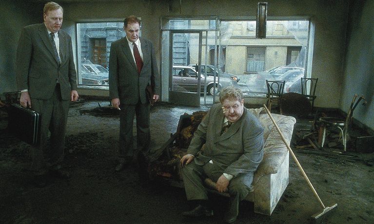 Like an Ingmar Bergman movie as realized by Monty Python: It's seriously gloomy about the loss of spirituality in the world, but at the same time rudely, sometimes hilariously, absurd.