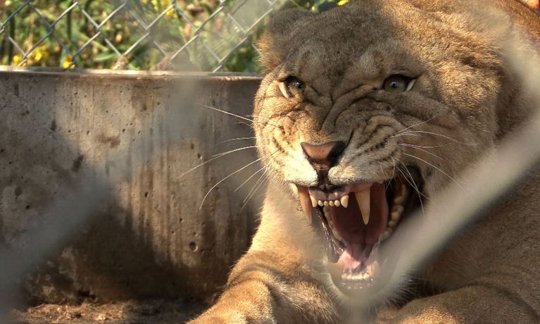 Spends rather too much time in the troubling company of Terry Brumfield, a barely mobile invalid who houses two full-grown African lions and their four cubs in a trailer in his backyard.