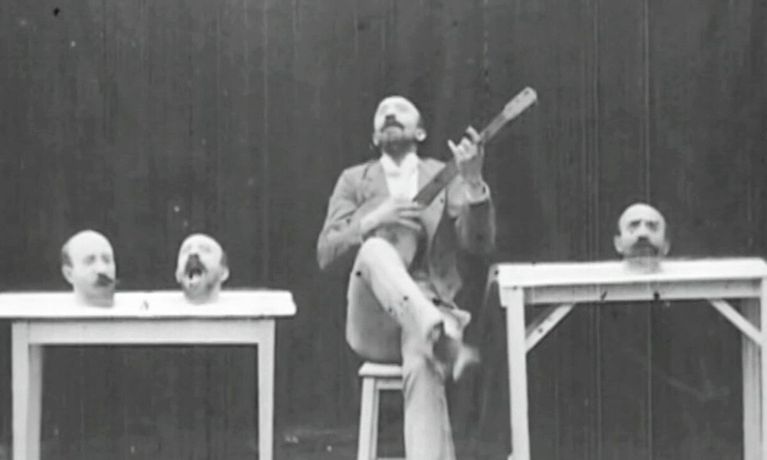 One of the greatest of black art pictures. The conjurer appears before the audience, with his head in its proper place. He then removes his head, and throwing it in the air, it appears on the table opposite another head, and both detached heads sing in unison. The conjurer then removes it a third time. You then see all three of his heads, which are exact duplicates, upon the table at one time, while the conjurer again stands before the audience with his head perfectly intact, singing in unison with the three heads upon the table. He closes the picture by bowing himself from the stage.