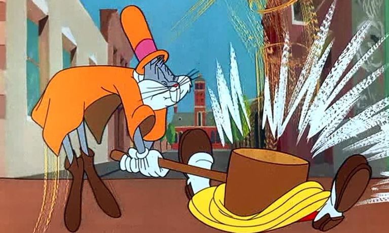 The Disassociated Press wants Bugs Bunny's life story. Got a pencil? "First," says Bugs, "I was born." He quickly learns he is different from the other children: he's a "rabbit in a human world." He grows up to accept repetitive chorus boy jobs in such Broadway revues as "Girl of the Golden Vest," "Wearing of the Grin" and "Rosie's Cheeks." His career hits the skids and he's living on a park bench before he's discovered by that great vaudeville star, Elmer Fudd. Their dual comedy act is a hit, which leads to film roles. Will Bugs Bunny ever have to look back?